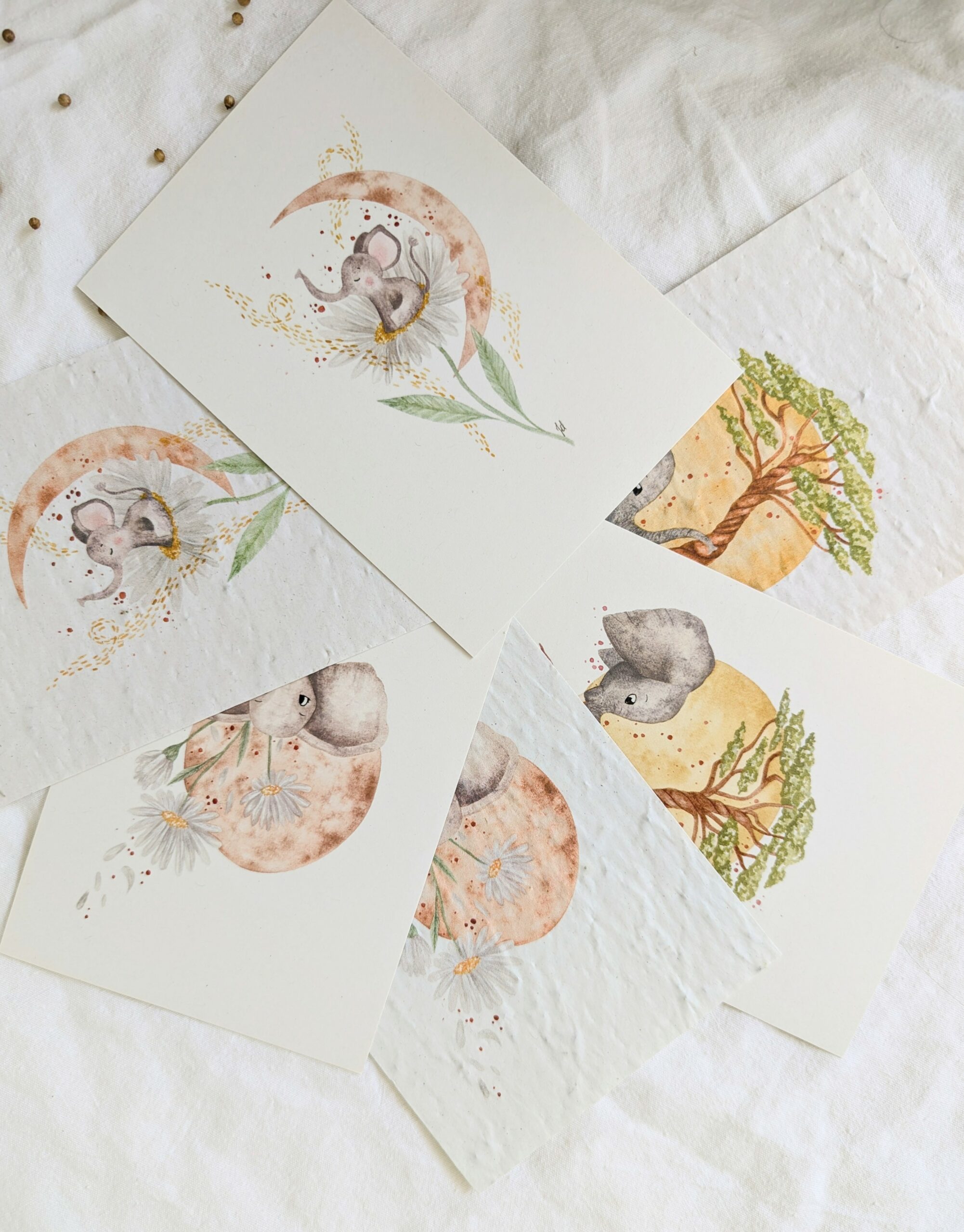 - 6 cartes (re)naissance d’une Famille : 3 cartes ensemencées pour semer votre amour et 3 cartes postales pour déposer vos mots d’amour à l’occasion de cette naissance. Chaque carte est dédiée à un membre de la famille : bébé – papa – maman.
