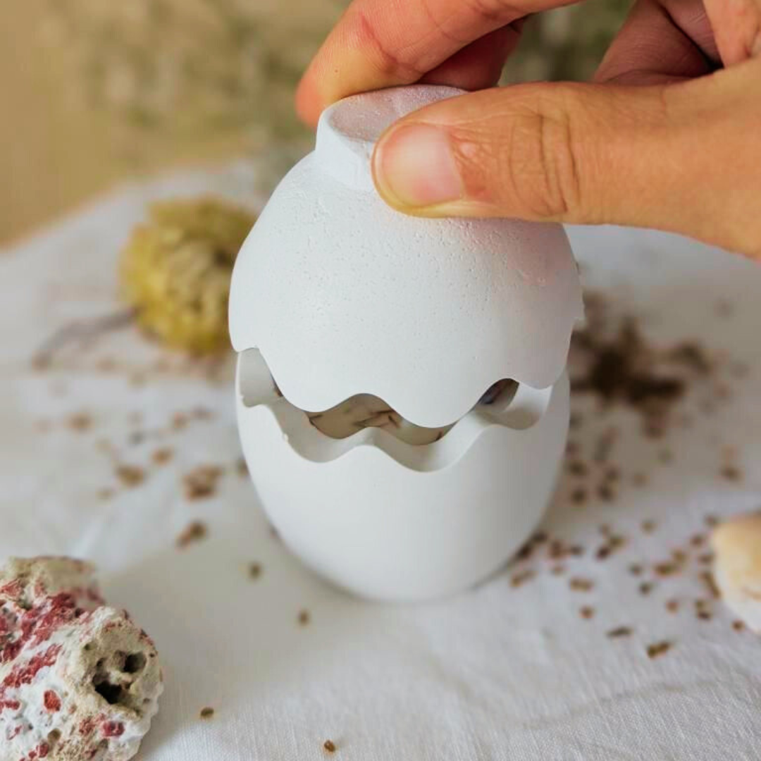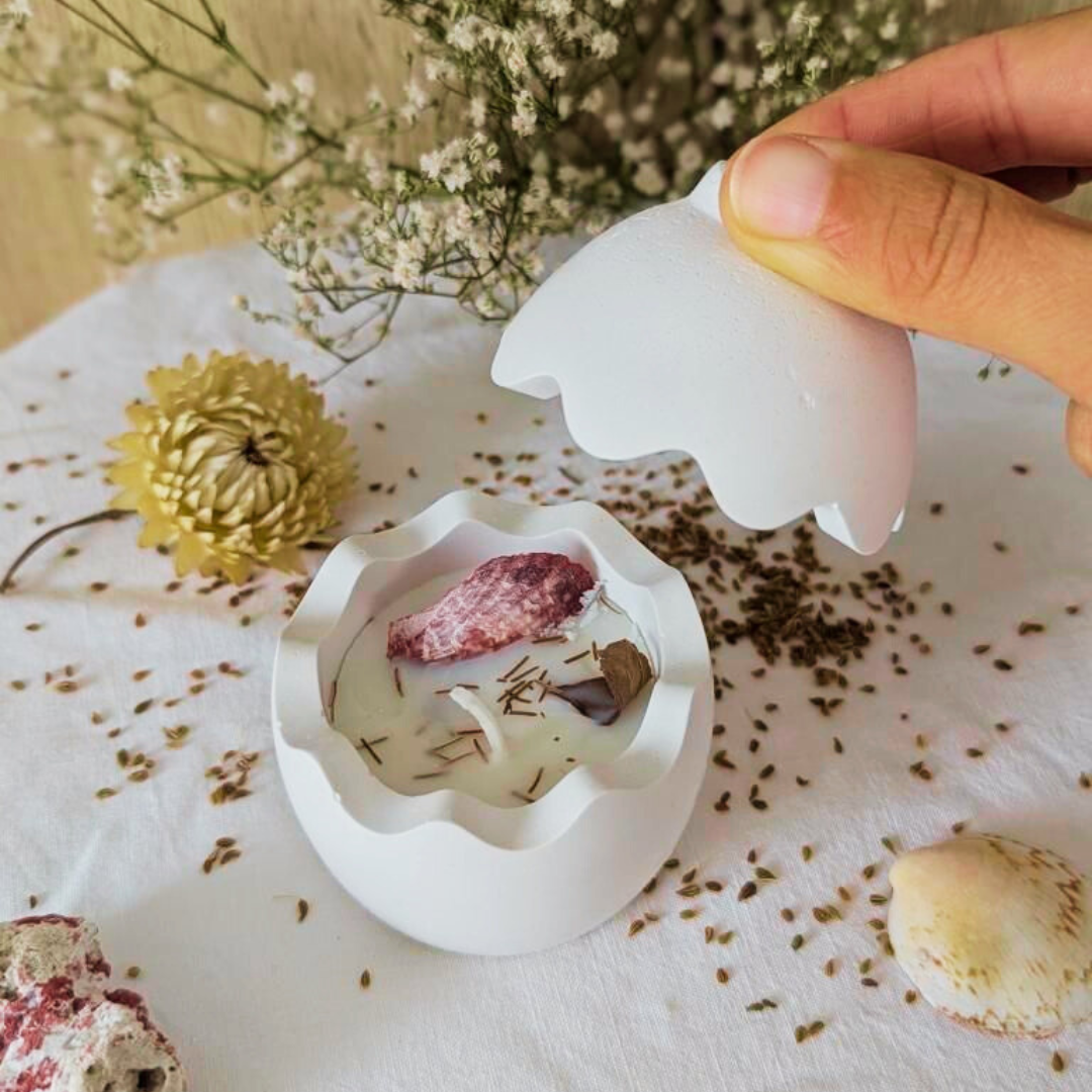- La bougie “éclosion” : Une bougie en forme d’œuf qui a éclot. Un puissant symbole de Vie, de naissance, d’infini, de cycle biologique…
