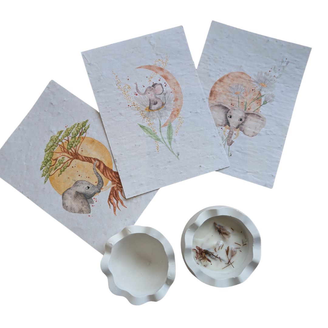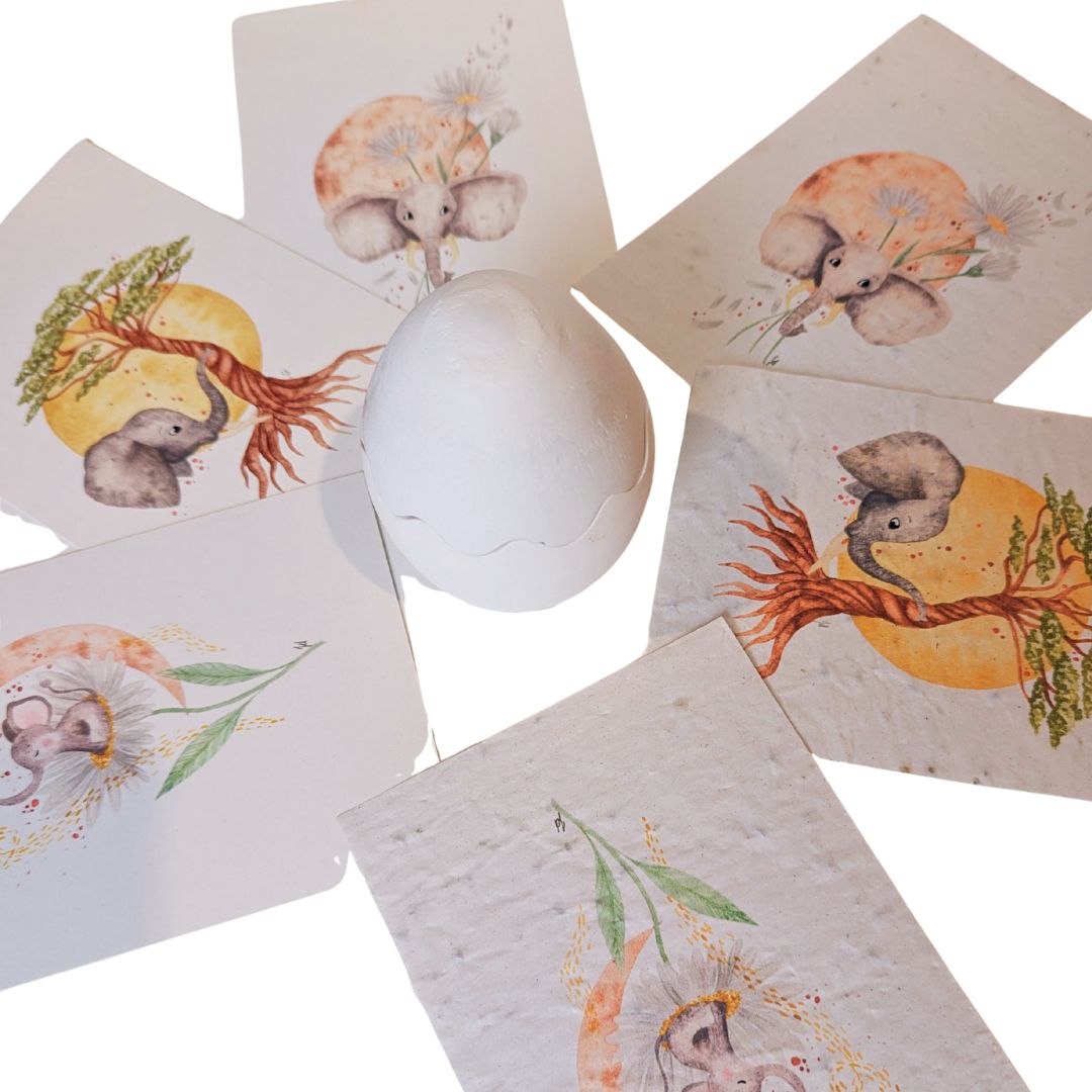 S’agissant des cartes ensemencées représentant la famille naissante (papa, maman, bébé), elles sont particulières en ce qu’elles contiennent des graines d’un mélange de fleurs. Elles sont destinées à être déposées dans un pot ou dans un jardin, sur de la terre. Il suffira ensuite de les humidifier et de les recouvrir avec une fine couche de terre d’environ 1cm puis de les arroser chaque jour et d’observer les premières graines germer au bout de quelques semaines. Ce geste de “semer” révèle cette connexion profonde à la Nature et incarne ce cycle de la vie.